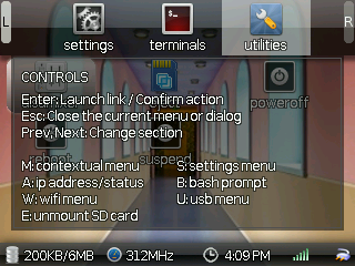 My favorite new feature is that Gmenu2x can now launch an app without closing, similar in experience to full scale systems. As in prior versions, the Home key returns to Gmenu2X, but the action will now leave the current app running in the background. It’s a really nice feature when combined with the zram driver, thanks go to mozzwald for the details on configuring zram in the Linux kernel. When GMenu2x is active, pressing the Tab key will produce a list of running apps. GMenu2x will switch to the selected apps’ controlling terminal. Apps in the list can also be stopped instead, by using the BackSpace key on the selected item. There are a few ways to navigate between the open virtual terminals. The easiest way is to use the Home key to return to GMenu2x and then press Tab to show the list of running apps, then just select the one you want to switch to. Alternatively, the Alt+Tab, Alt+LeftArrow and Alt+RightArrow key combos will increment and decrement the virtual terminal.